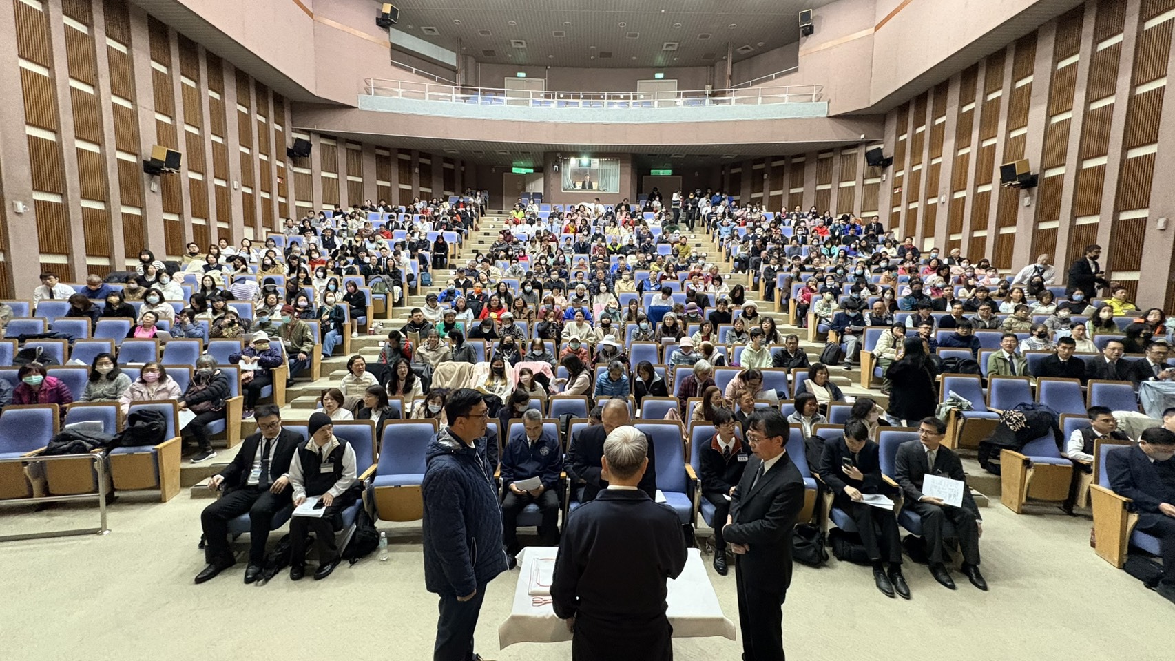 會場可容納六百人,地點適中,周邊道路寬敞,停車非常方便。聖徒們利用各樣交通工具前來,並魚貫的進入會場。聚會開始用相調詩歌『神將你我安置一起』揭開序幕。詩歌說:『神將你我安置一起,同來建造祂的身體;你的基督是我盼望,我的基督也供應你。我活,若你在主裏站立;你活,若我在主裏堅定。我的往前是為你;你的往前是為我。不是單獨的肢體,我真迫切需要你…』各會所的聖徒相調的歡唱詩歌,歌聲響徹會場,場面令人動容。